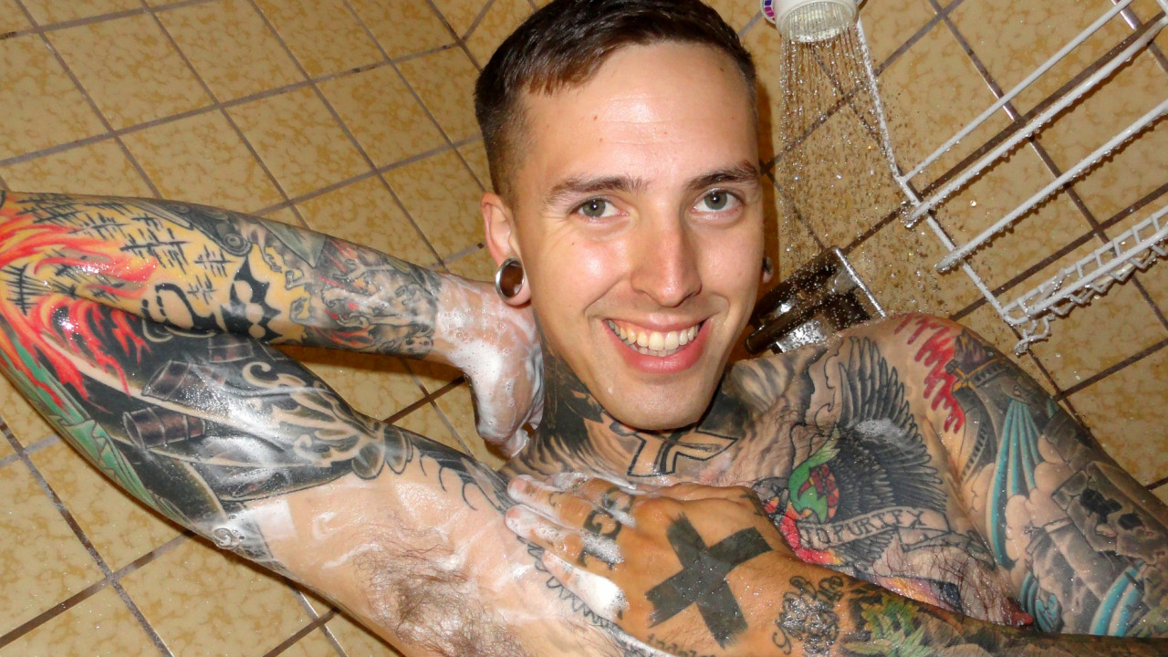 Ruckus takes his time washing his bits and pieces and slowly works his way down his body getting his armpits, chest, and stomach all soapy and bubbly before moving down to his dark, thick, trimmed pubes and giant lowhanging balls. Once his balls are clean, he moves on down the line all the way to his feet. Nearly every square inch of Ruckus' hot body is covered in tats. The cameraman asks Ruckus to turn around and show off his asshole and Ruckus is more than happy to oblige.