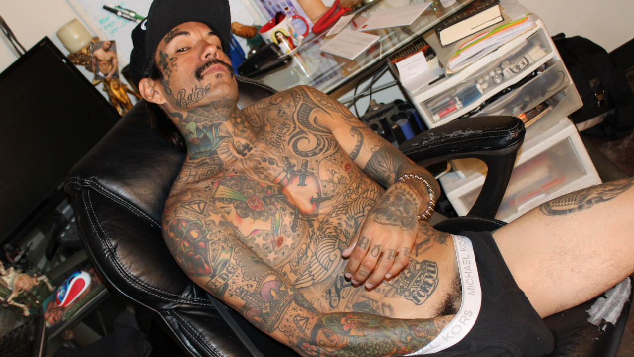Once he sits in his chair, Thrasher doesn't waste a second getting hard. He's more tatted up than ever and he's ready to show off. He grabs his cock and gets to work watching porn and pumping his hard throbbing dick. Thrasher is a man of pro status and blasts his load twice in less than 15 minutes before getting up, grabbing his paycheck, and heading off to LAX to get his flight to New York.